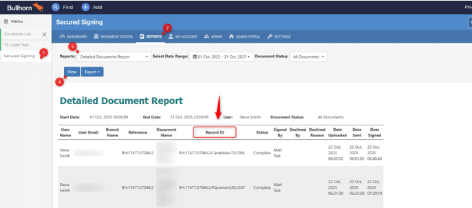 In Bullhorn, you can see this report by going to Menu -> Marketplace -> Secured Signing -> Reports, then selecting ‘Detailed Documents Report’ and clicking ‘View’: