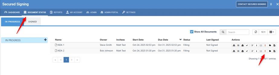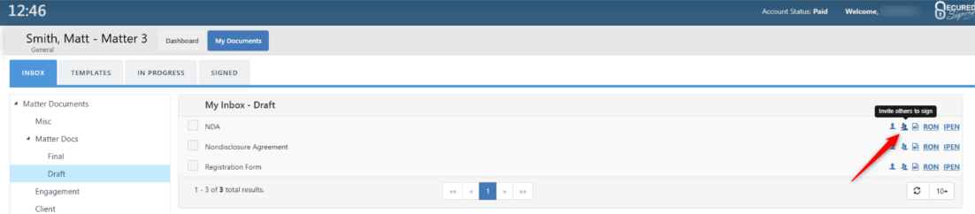 This will take you to the Inbox tab in the My Documents page, showing you all the documents that are in the matter you started from. From here, you can open any of these documents in I Sign, We Sign, RON, or IPEN to start a signing process.