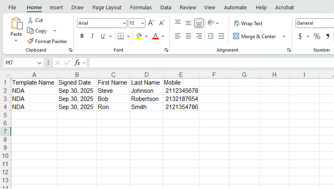 The exported report contains the name of the template, the date it was signed, and the data that the invitees entered into the fields:
