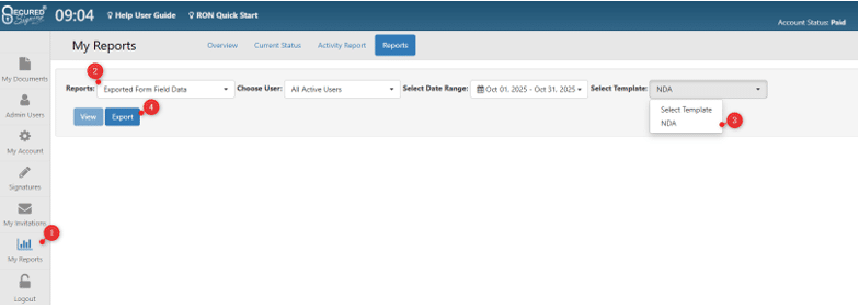 After completing at least 1 signing process with this template, you can export a report containing the field data of each signing by doing the following:
