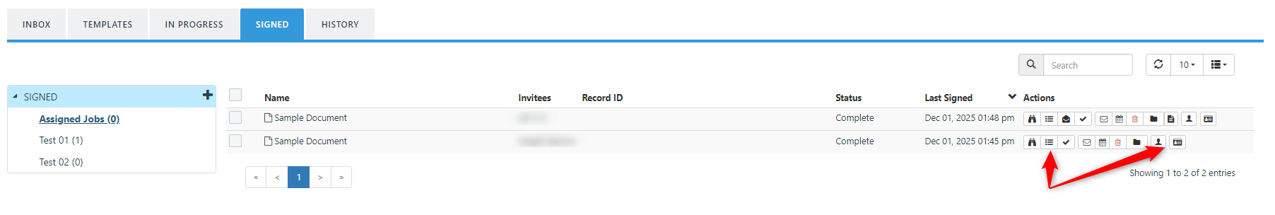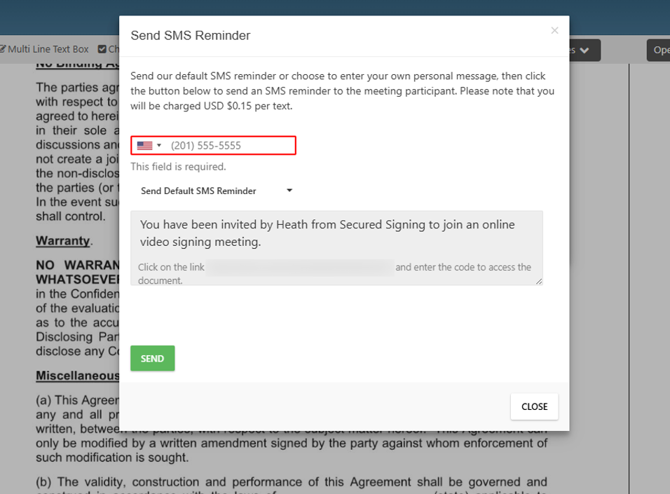 This enhancement adds conveniently placed email and SMS reminder buttons in the ‘Video Participants’ pop-up during a video signing session. When you open this pop-up and see that an invitee has not yet joined the session, you can click ‘Send Email Reminder’ or ‘Send SMS Reminder’ to send them a message asking to join the session.