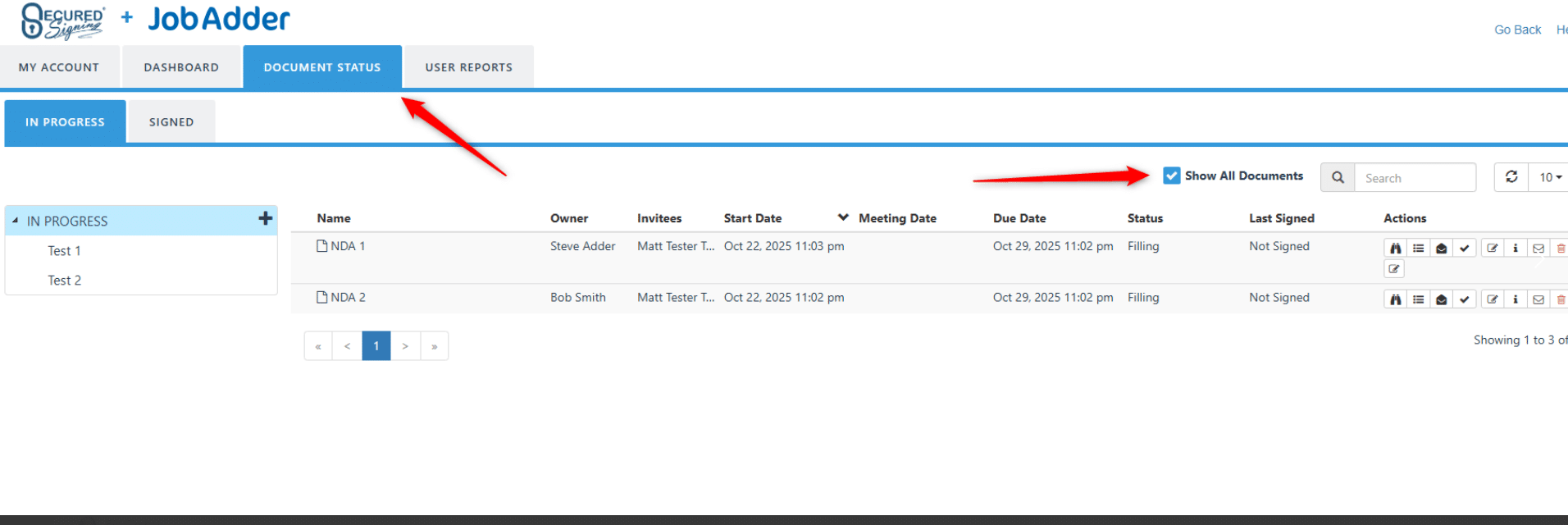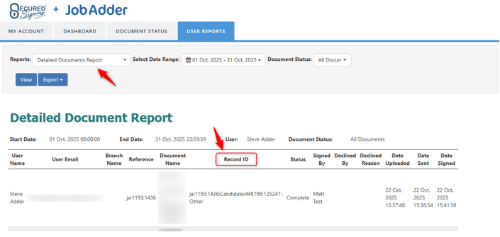 In JobAdder, you can see this report by going to any record, clicking the ‘Actions’ button and selecting Secured Signing -> Dashboard from the dropdown menu, going to the ‘User Reports’ tab, and then selecting ‘Detailed Documents Report’ and clicking ‘View’: