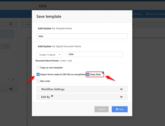 To enable this option, when you are saving a template enable the ‘Export form’s data to CSV file on completion’ option and the ‘Keep Data’ option that displays next to it.