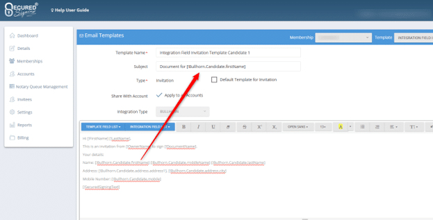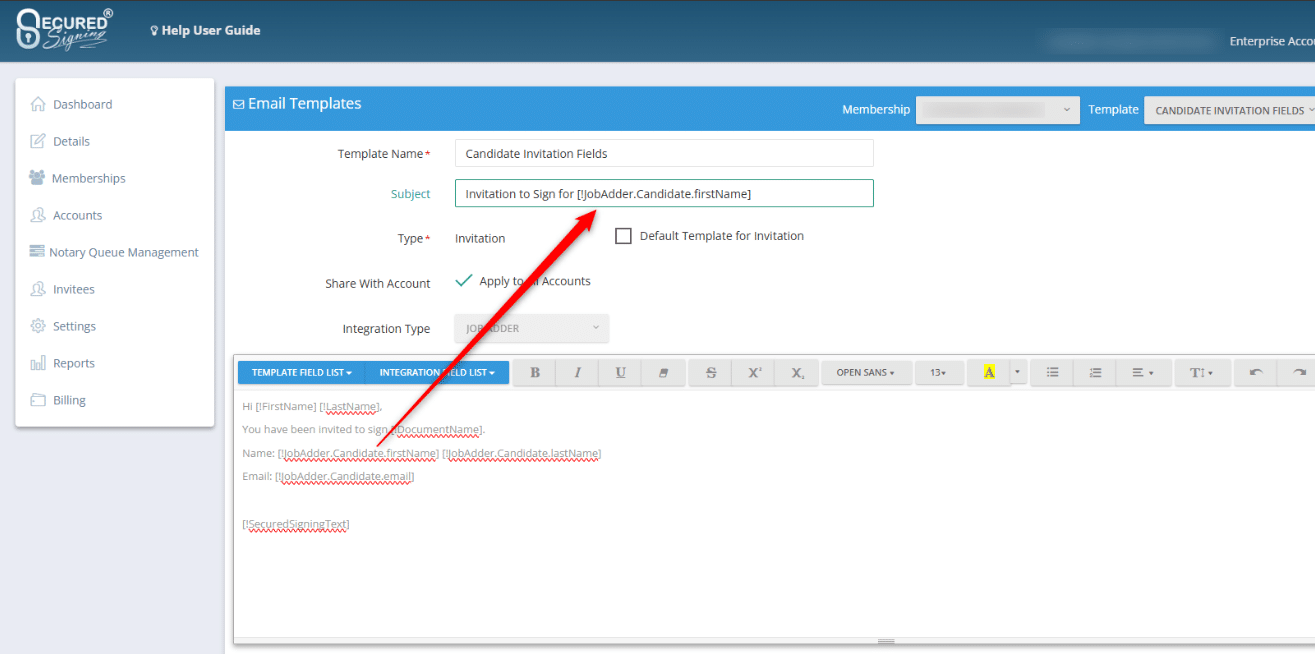 This enhancement for integration fields in email templates in Bullhorn and JobAdder allows you to use these fields in the subject line of the email templates as well. To add these fields, login to the Secured Signing enterprise portal as an admin user, then go to Settings -> Email Templates and create a new email template or open an old one. Then, when editing your email template, you can select any field from the ‘Integration Field List’ dropdown and its sub-dropdowns. Then, copy and paste the placeholder tag into the subject line.