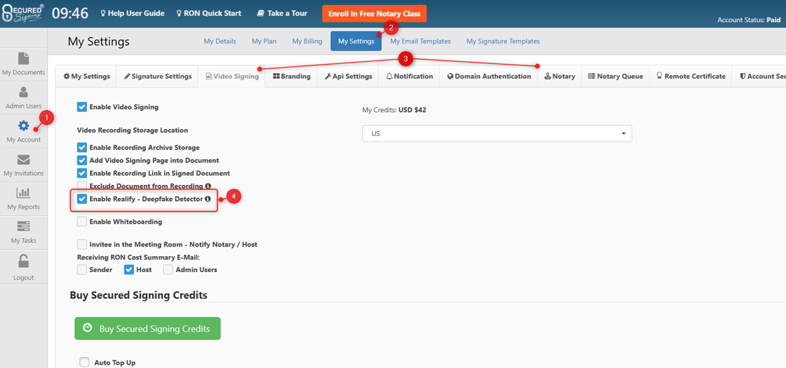 To enable Realify – Deepfake Detector go to My Account -> My Settings -> Notary, or My Account -> My Settings -> Video Signing, then check the Enable Realify – Deepfake Detector setting. You must confirm you have read the disclaimer and agree to using Realify – Deepfake Detector.