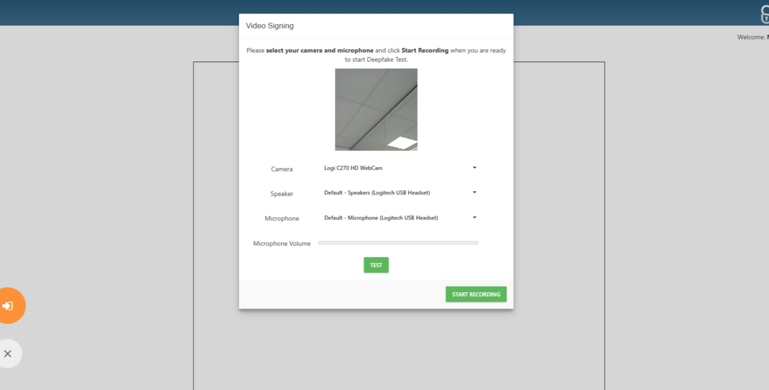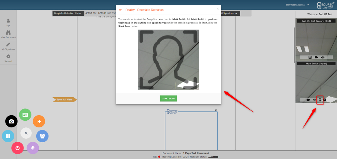 You can also trigger a second Deepfake Detection for your invitees once you’re in the video signing meeting by clicking the button “Start Deepfake Detection” button next to the invitee’s webcam, and once you are happy with how the invitee is positioned in the outline, “Start Scan”.