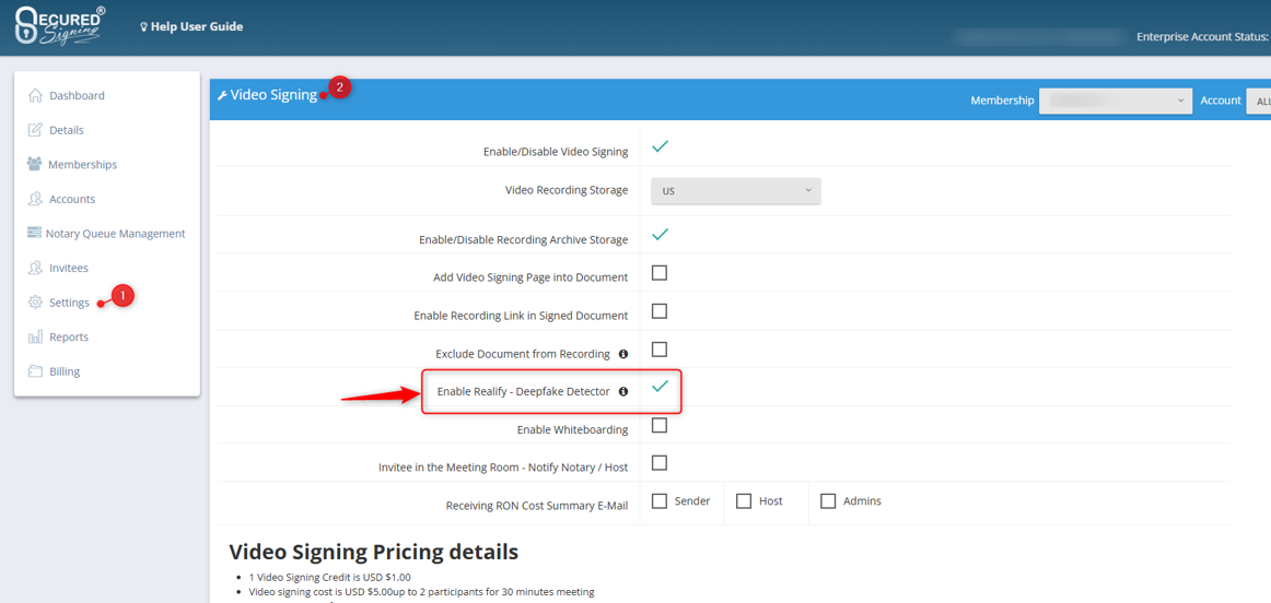 To enable the feature for accounts in a membership, login to the enterprise portal and go to Settings -> Video Signing, then check the Enable Realify – Deepfake Detector setting. You must confirm you have read the disclaimer and agree to using Realify – Deepfake Detector.