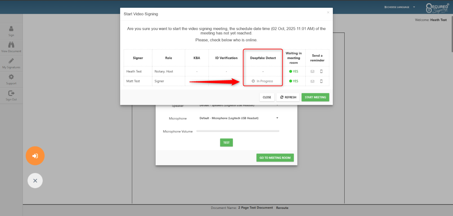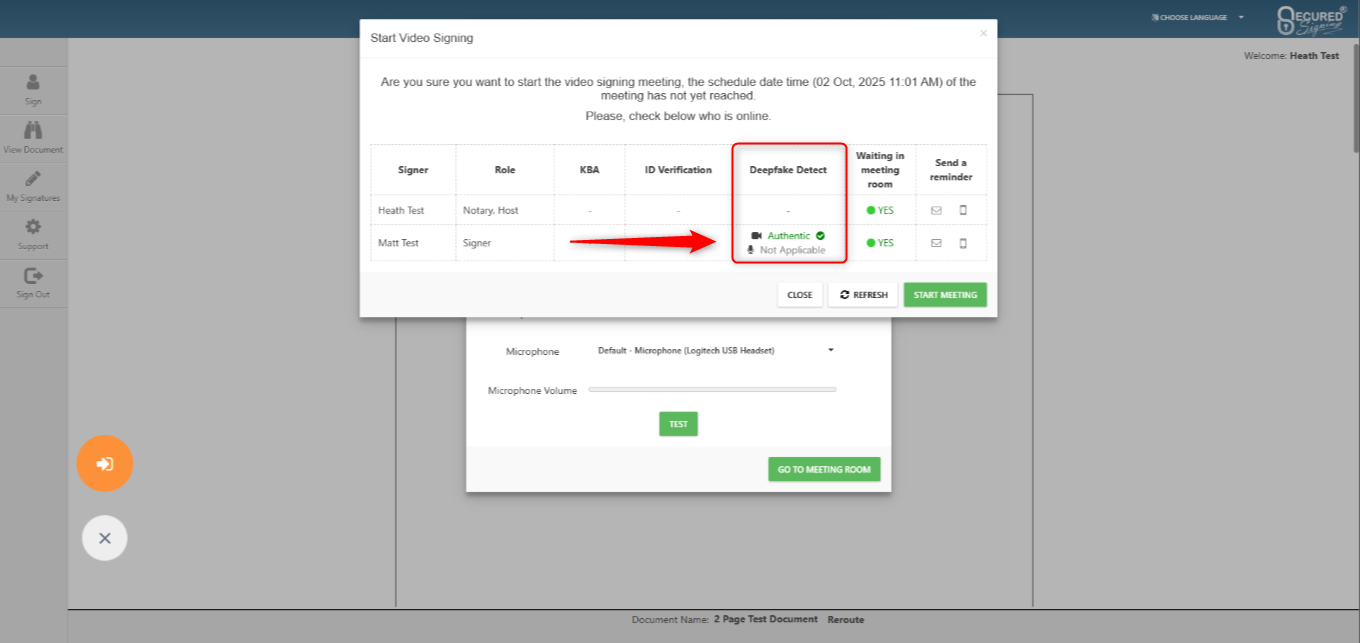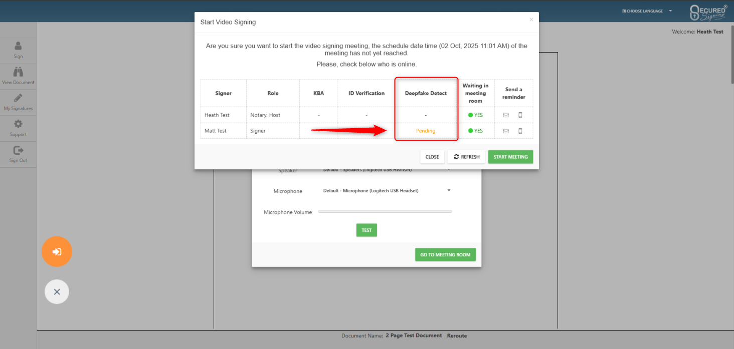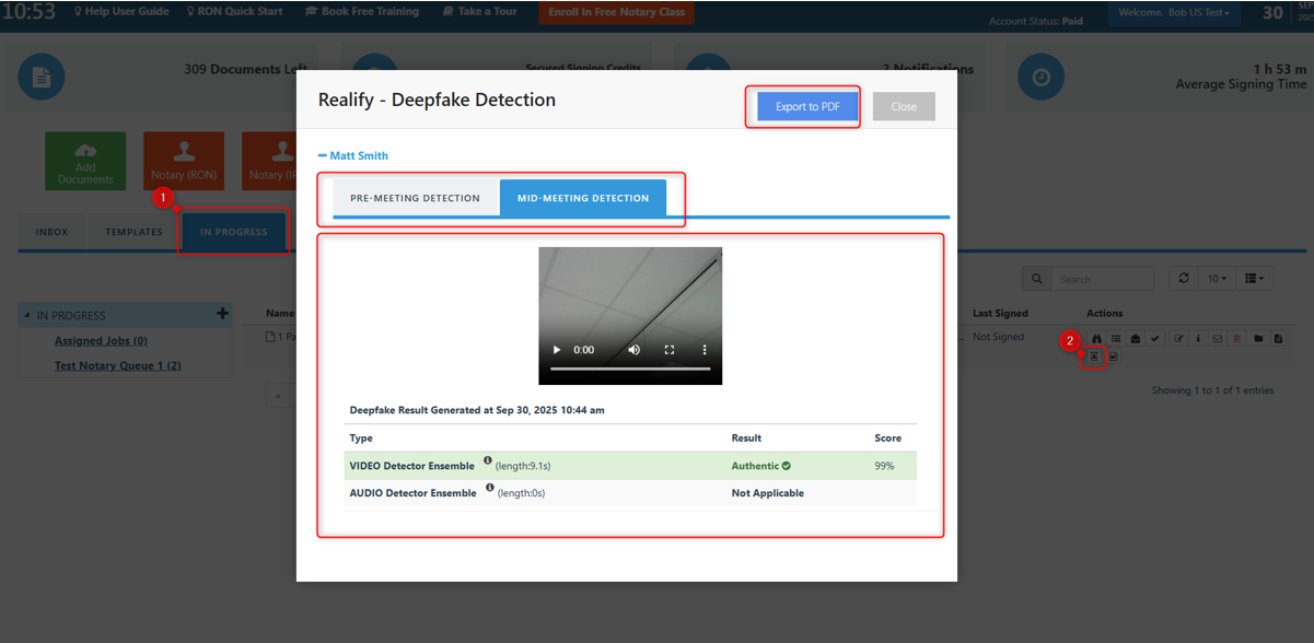 As the host of the RON or Video Signing meeting, you will be able to view the results of the Deepfake Detection before, during, and after the meeting. It is at the discretion of the host to continue or stop the meeting if they are unhappy with the results of the Deepfake Detection results, and are concerned about the realness of their invitees.