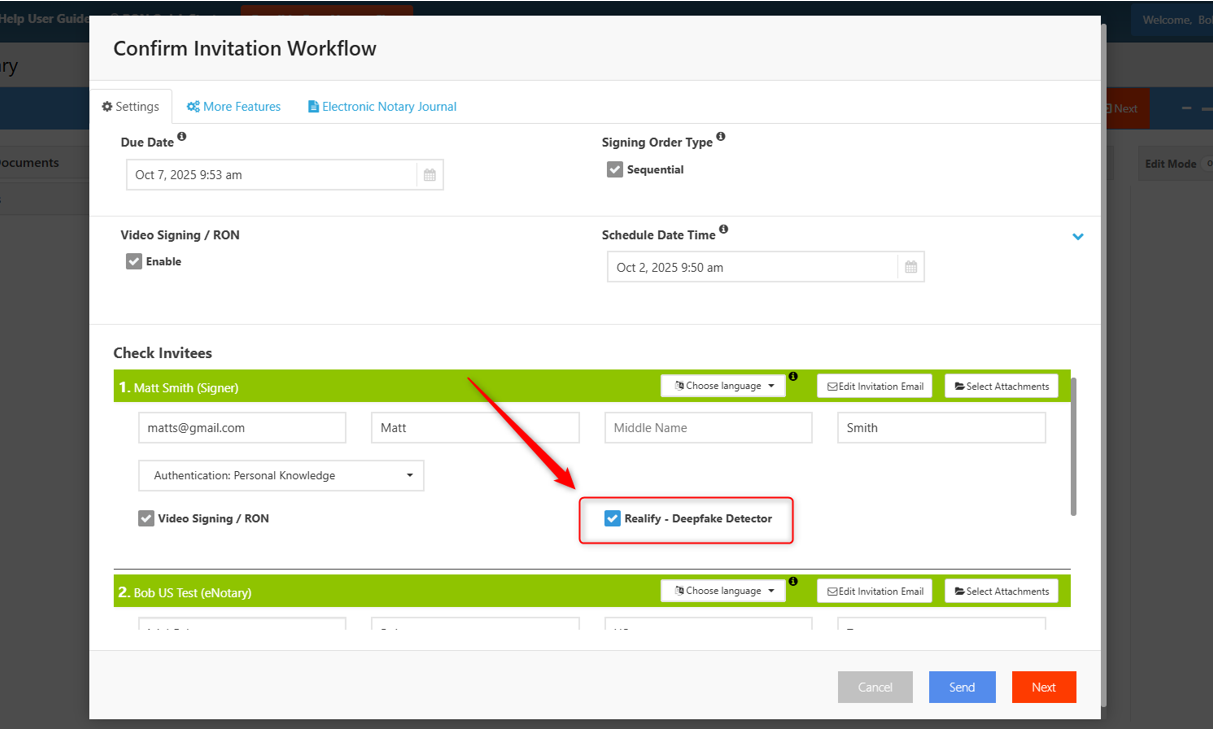 When Realify – Deepfake Detector is enabled, you will see the new Realify – Deepfake Detector setting in both the RON wizard and the invitation workflow, and it will enabled for all invitees by default.