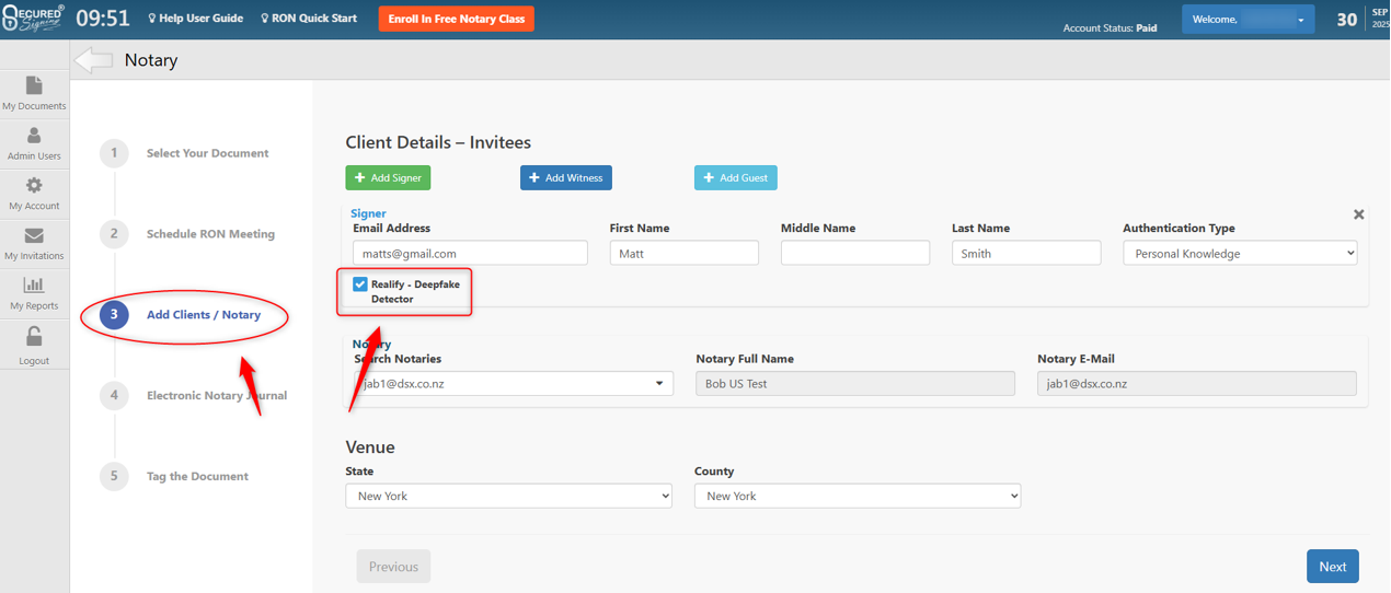 The Realify – Deepfake Detector feature protects against the use of deepfake technology by invitees in your Remote Online Notarization (RON) and Video Signing meetings. It does this by requiring your invitees to complete a Deepfake Detection before joining the RON or Video Signing meeting, and allowing you to trigger a second, mid-meeting Deepfake Detection, then providing you the results of the detections.