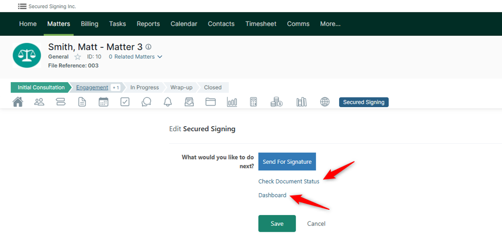 Also from the ‘Secured Signing’ tab in a matter, you can click Check Document Status to see your document’s signing progress, and you can click Dashboard to see account details and connect more users from Actionstep to Secured Signing.