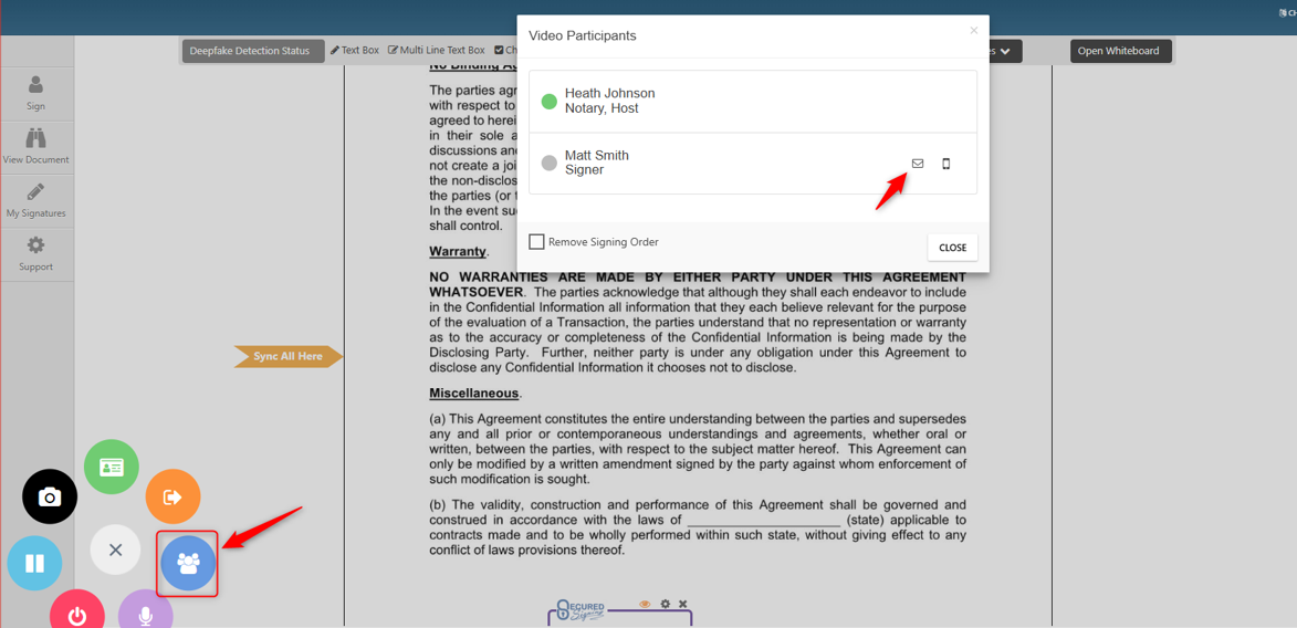 To use these buttons, first click the ‘Start to Manage Signers’ button in the control wheel to display the ‘Video Participants’ pop-up. Then, if you want to send an email reminder, click the ‘Send Email Reminder’ button.