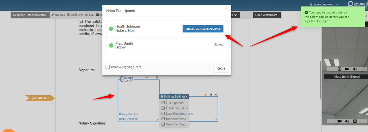 With this enhancement, once all invitees in a Remote Online Notarization session have finished signing, we have made it easier and more convenient for the notary to start stamping and signing the document themselves. All the notary has to do after all invitees have signed, is click either a notary stamp or a notary signature, and the ‘Video Participants’ pop-up will display, allowing the notary to click ‘Enable Sign/Screen Share’ and start signing.