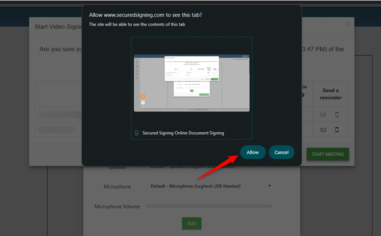 Now, when you as the host starts/joins to the video signing meeting, or when signing is enabled for the signer, a simple pop-up displaying, and all you need to do is click ‘Allow’, and screen sharing will begin: