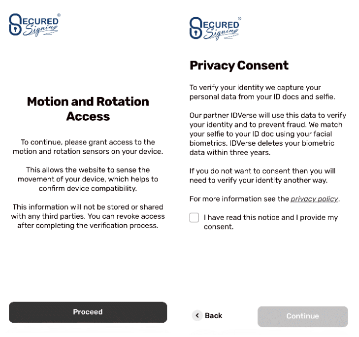 Once the invitee has opened the link to IDV on their smartphone, they will first be asked to grant motion and rotation access, then accept the privacy consent.