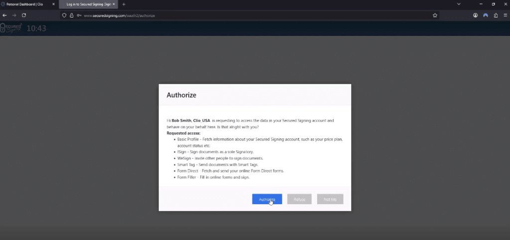 Finally, click Authorize to complete the connection between your Secured Signing and Clio accounts.